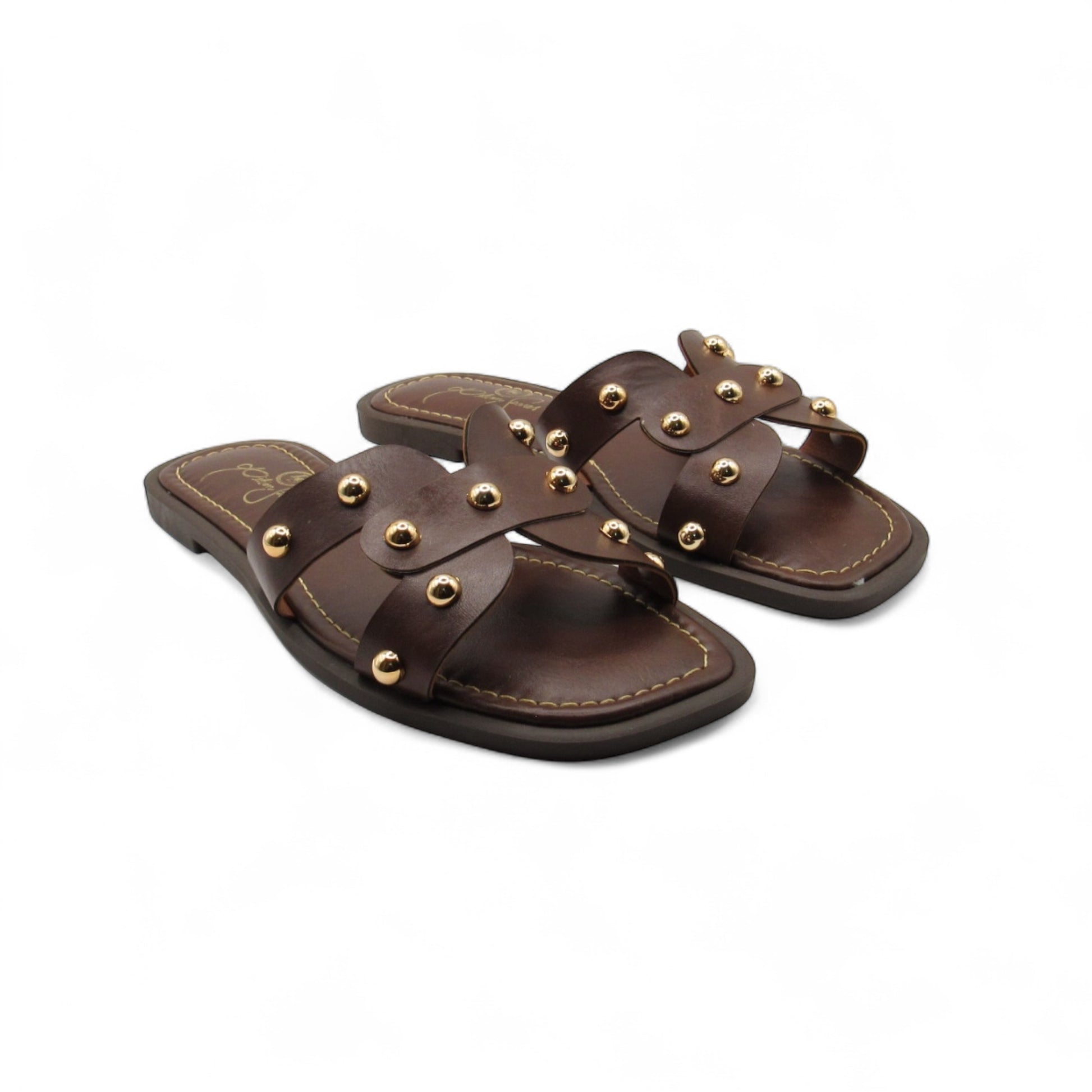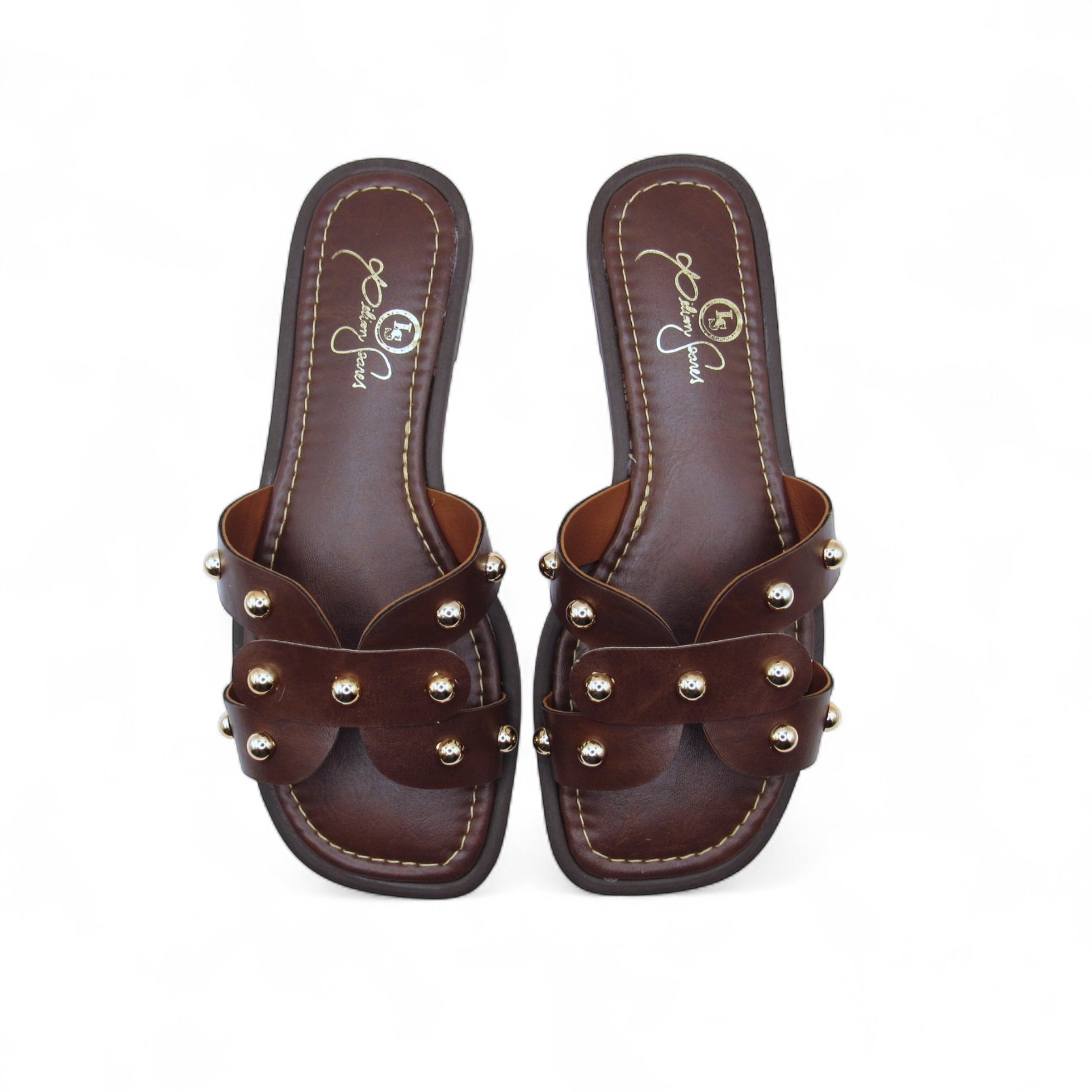 Rasteirinha marrom com cabedal entrelaçado e aplicações em hotfix