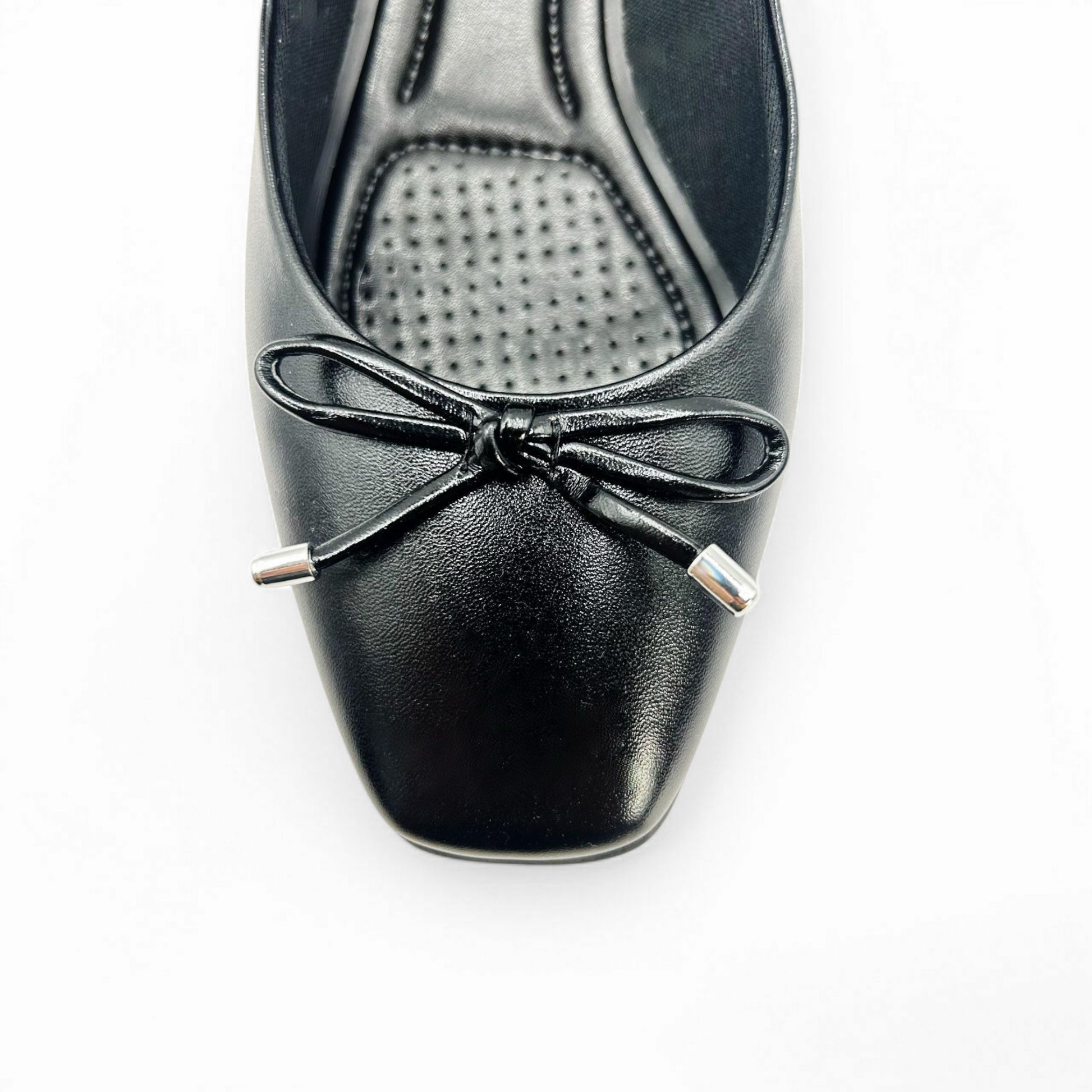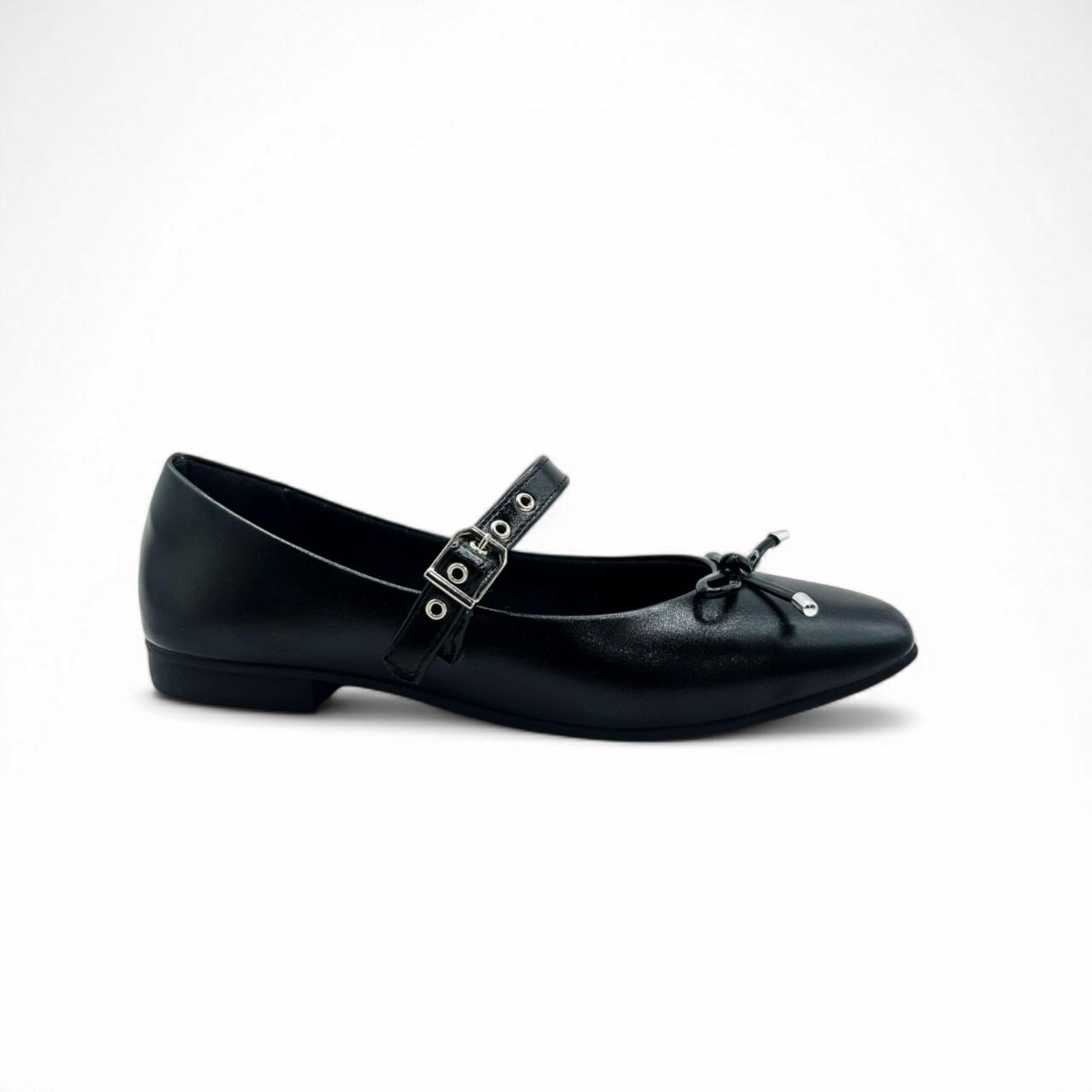 Sapatilha com design sofisticado e detalhes encantadores. O tom preto traz um toque de elegância e personalidade ao visual, enquanto o acabamento brilhoso realça a beleza do modelo. O laço delicado adiciona charme e feminilidade, complementado por ponteiras metálicas que dão um toque moderno.