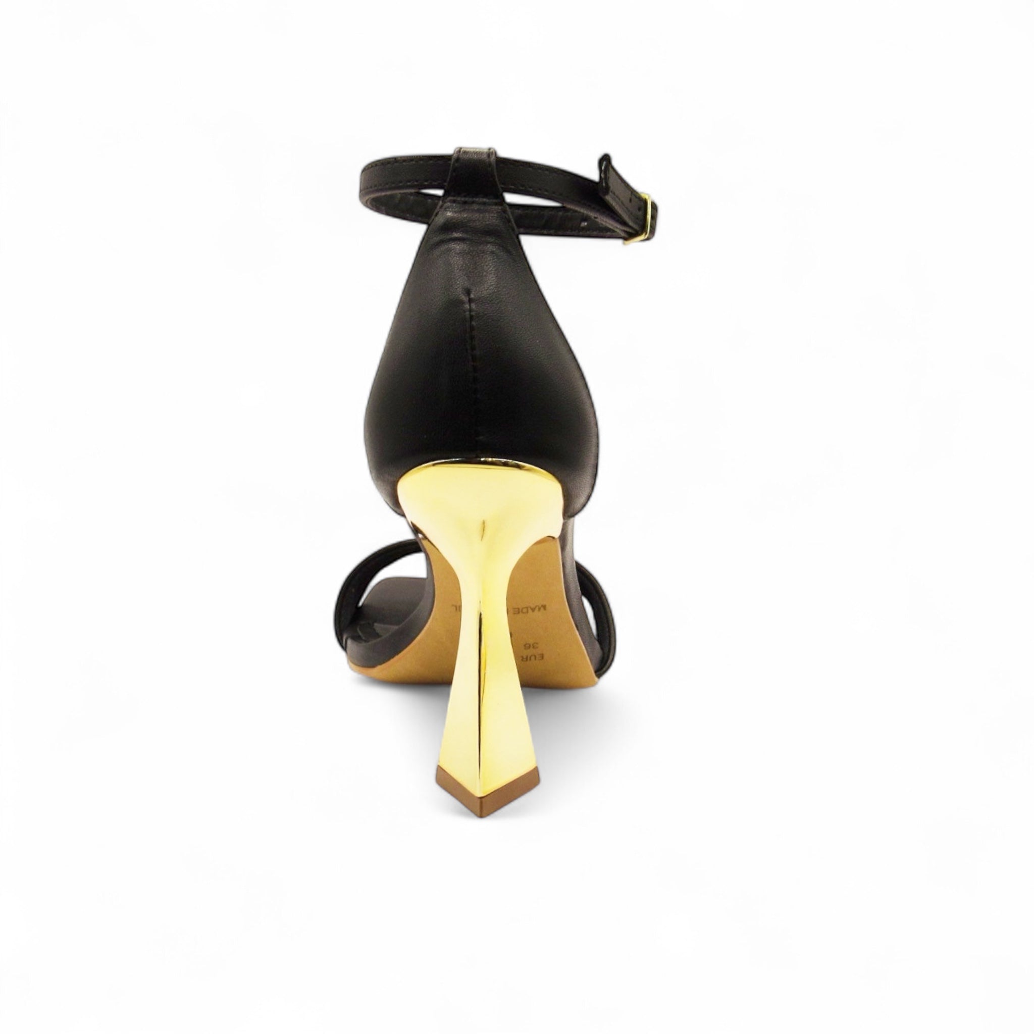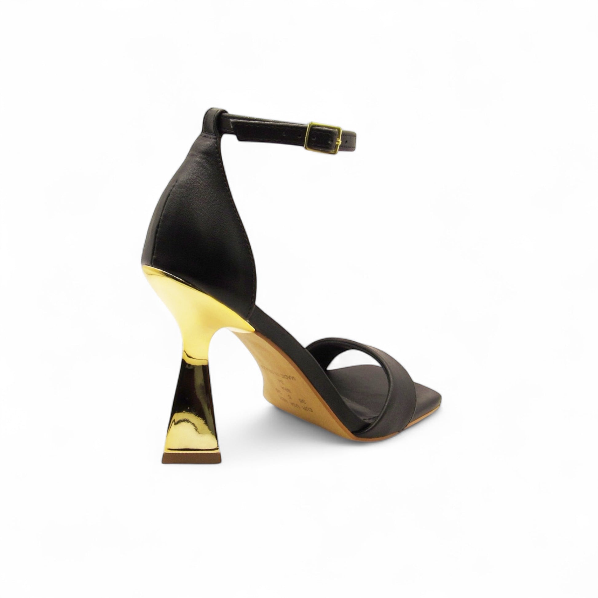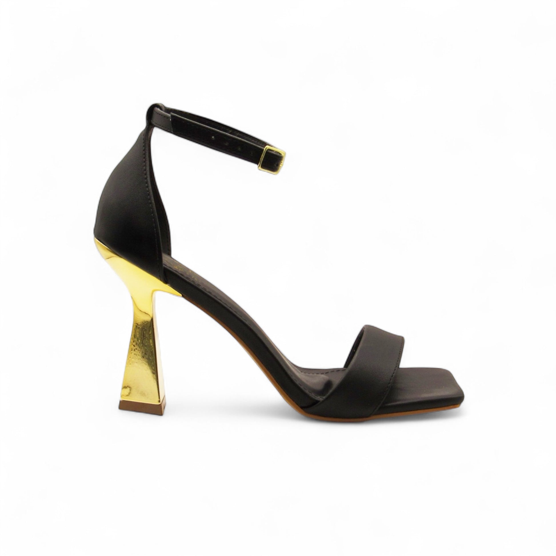 O grande destaque está no salto cromado dourado, que adiciona um ar sofisticado e moderno ao design. O contraste entre o preto intenso e o dourado espelhado cria uma combinação irresistível, capaz de transformar até o look mais simples em uma produção cheia de presença.