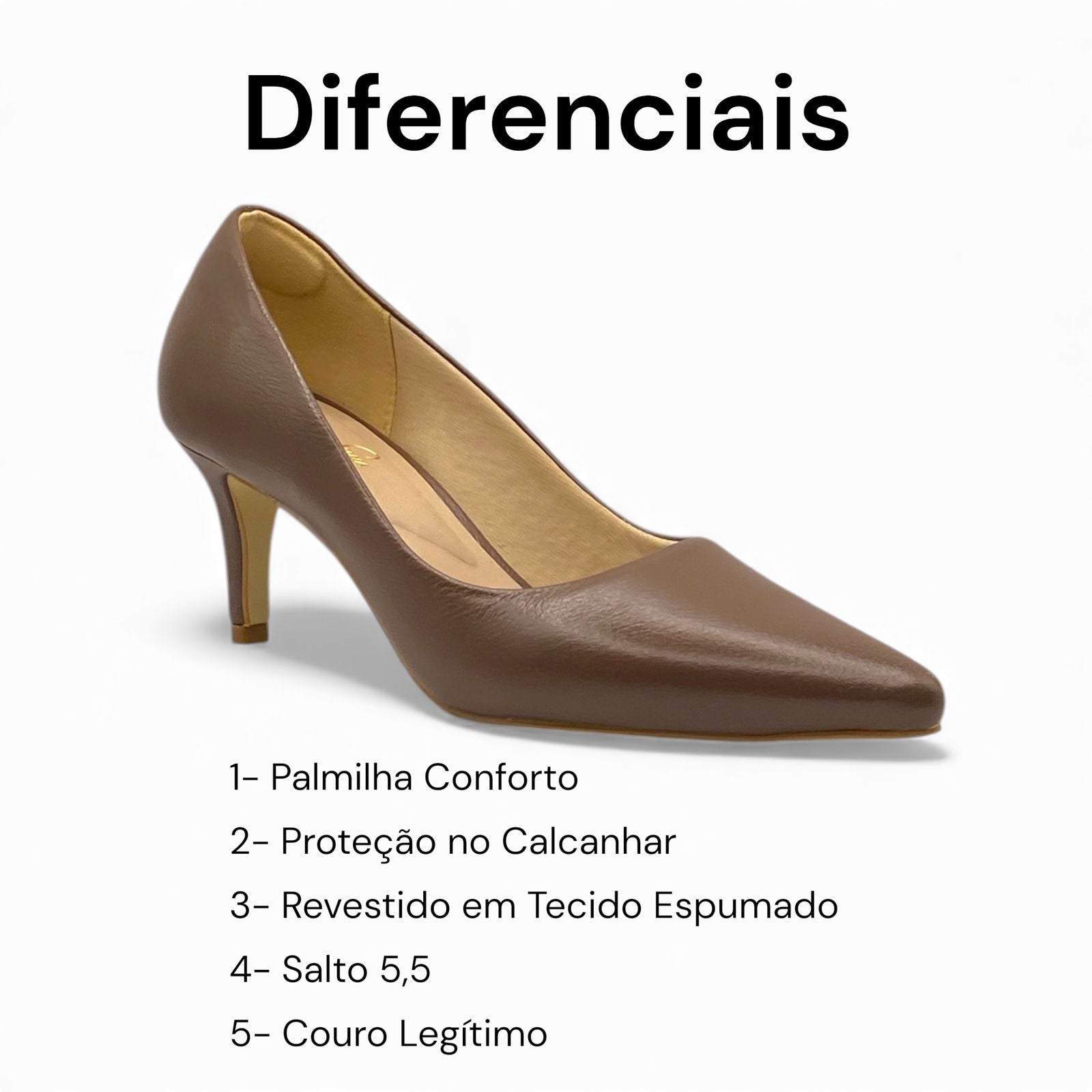 Salto de 5,5 cm: altura ideal para unir conforto e elegância.