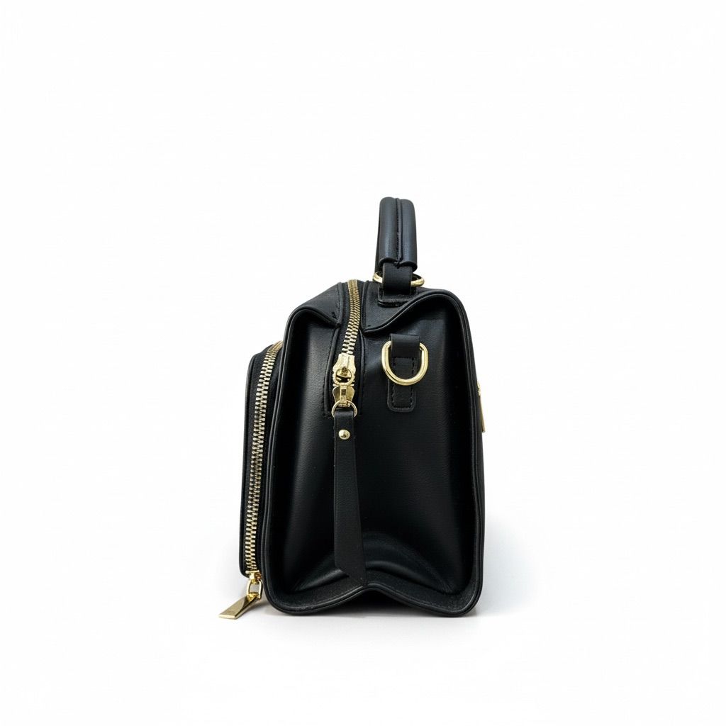 A cor preta traz elegância, versatilidade e sofisticação ao visual, enquanto os detalhes dourados nos fechos e acabamentos realçam o contraste da bolsa, adicionando um toque elegante e refinado à peça.