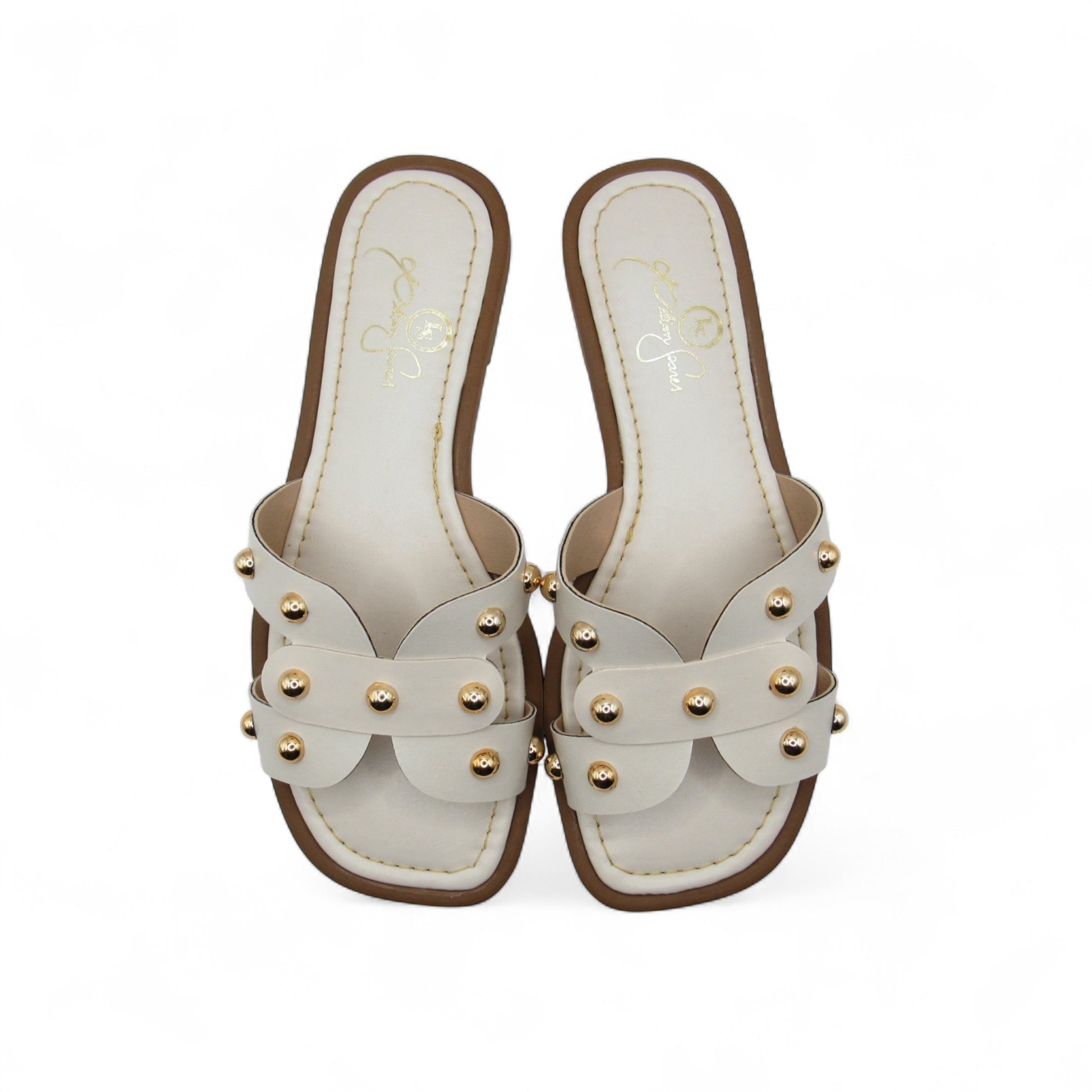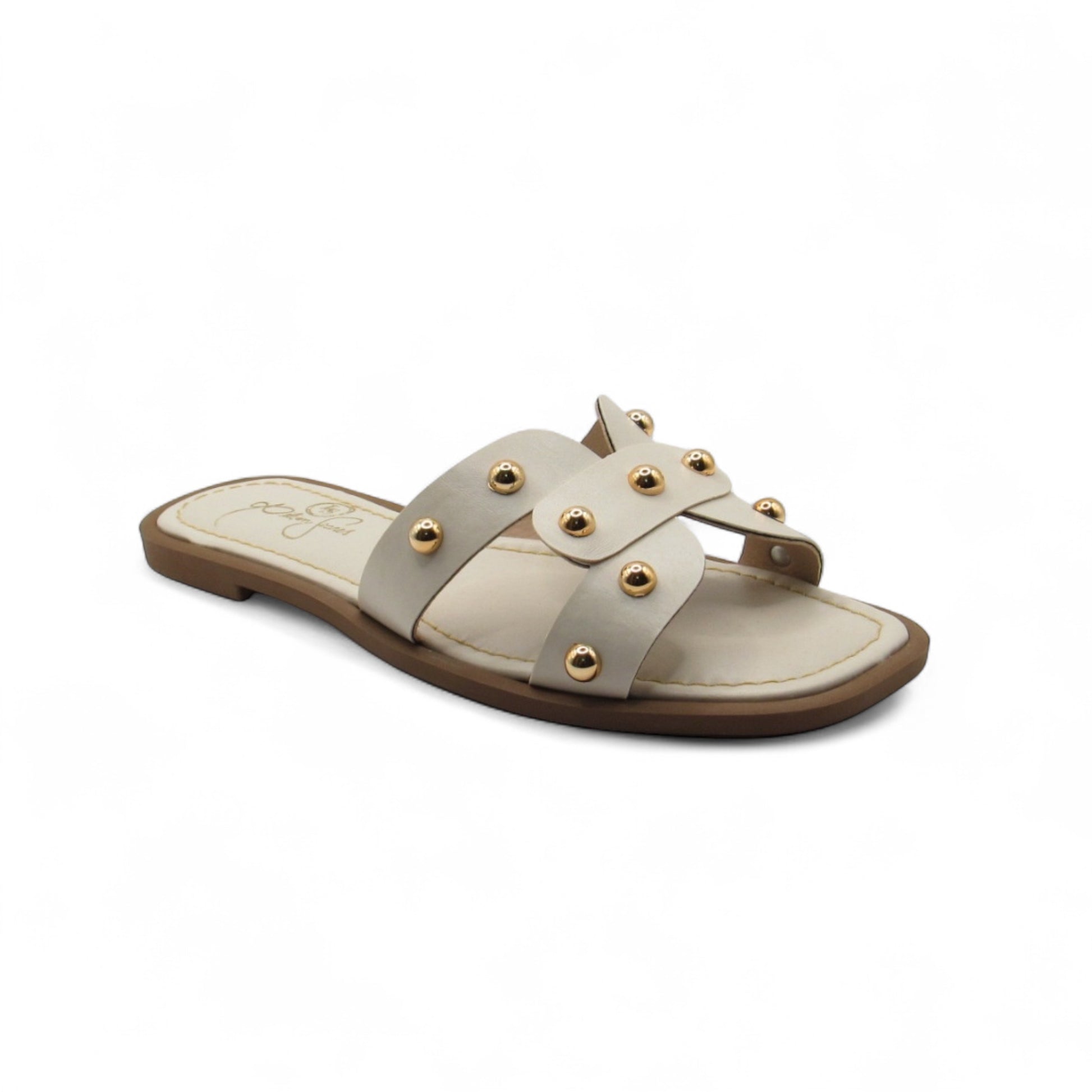 Rasteirinha Off White com cabedal entrelaçado e aplicações em hotfix