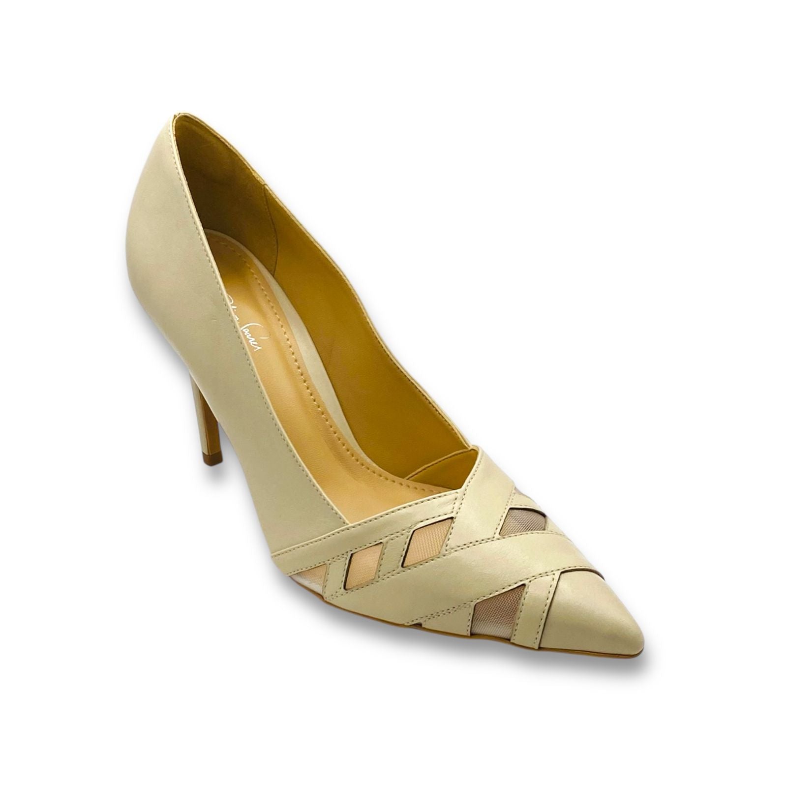 Scarpin Feminino Couro Off-White com Tela e Tiras Entrelaçadas – Salto 9cm