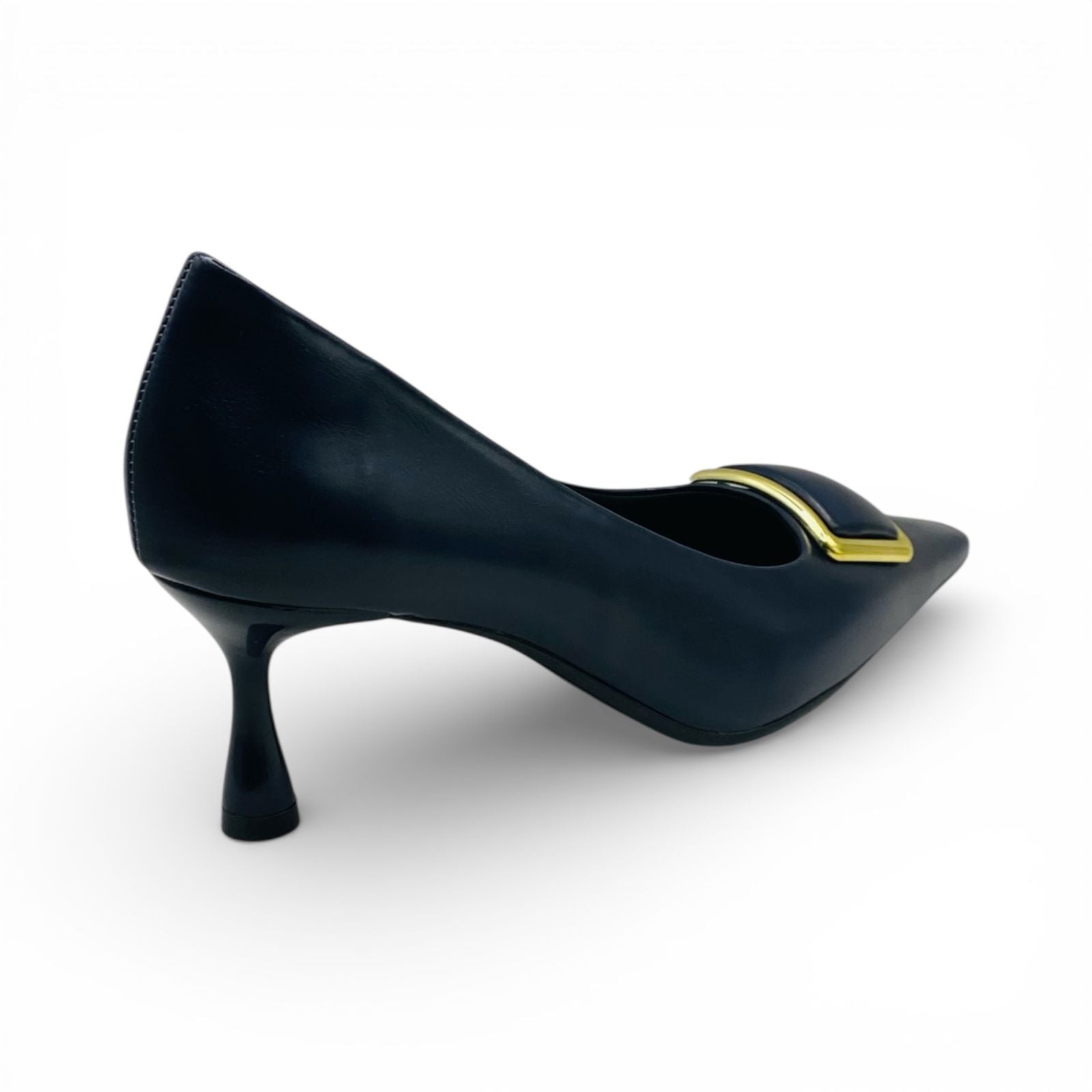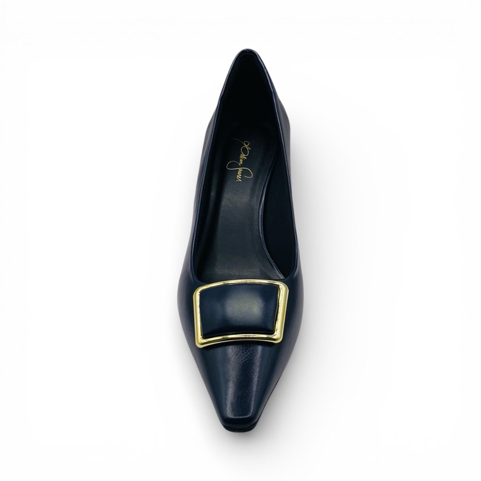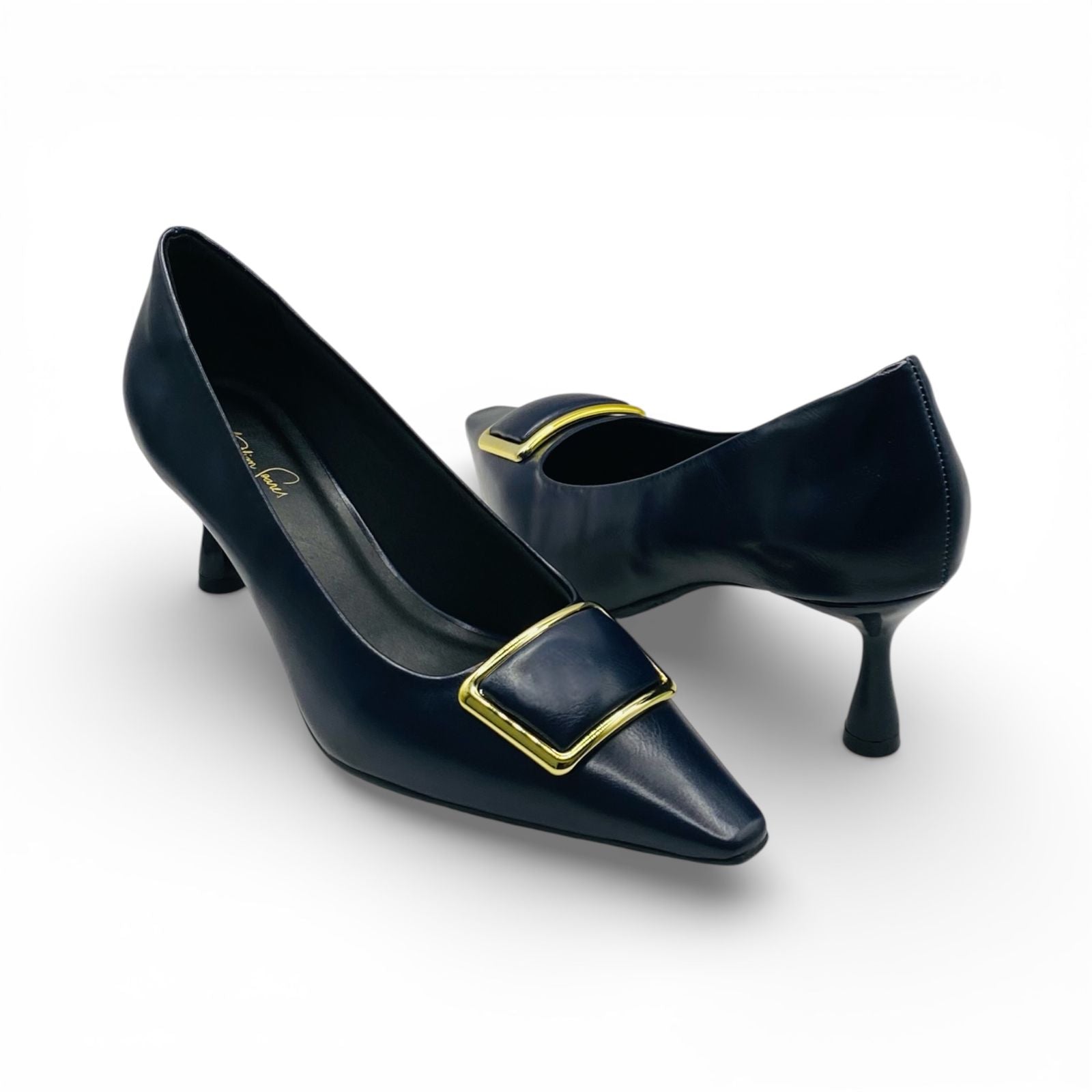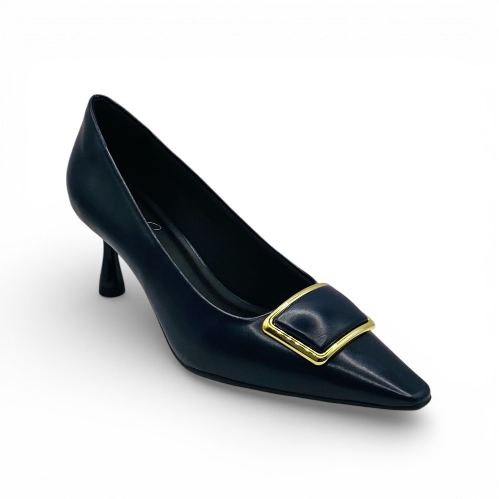 O Scarpin que faltava no seu closet para unir autoridade e feminilidade. Este modelo da Lilian Soares apresenta um acabamento soft gloss (meio brilho), proporcionando uma estética polida que transita perfeitamente entre o dia e a noite. Com bico fino estruturado, o calçado é adornado por uma fivela geométrica imponente com moldura dourada, elevando o design ao status de acessório de luxo. Internamente, o revestimento em tecido e a palmilha acolchoada garantem que a elegância não venha acompanhada de desconforto.