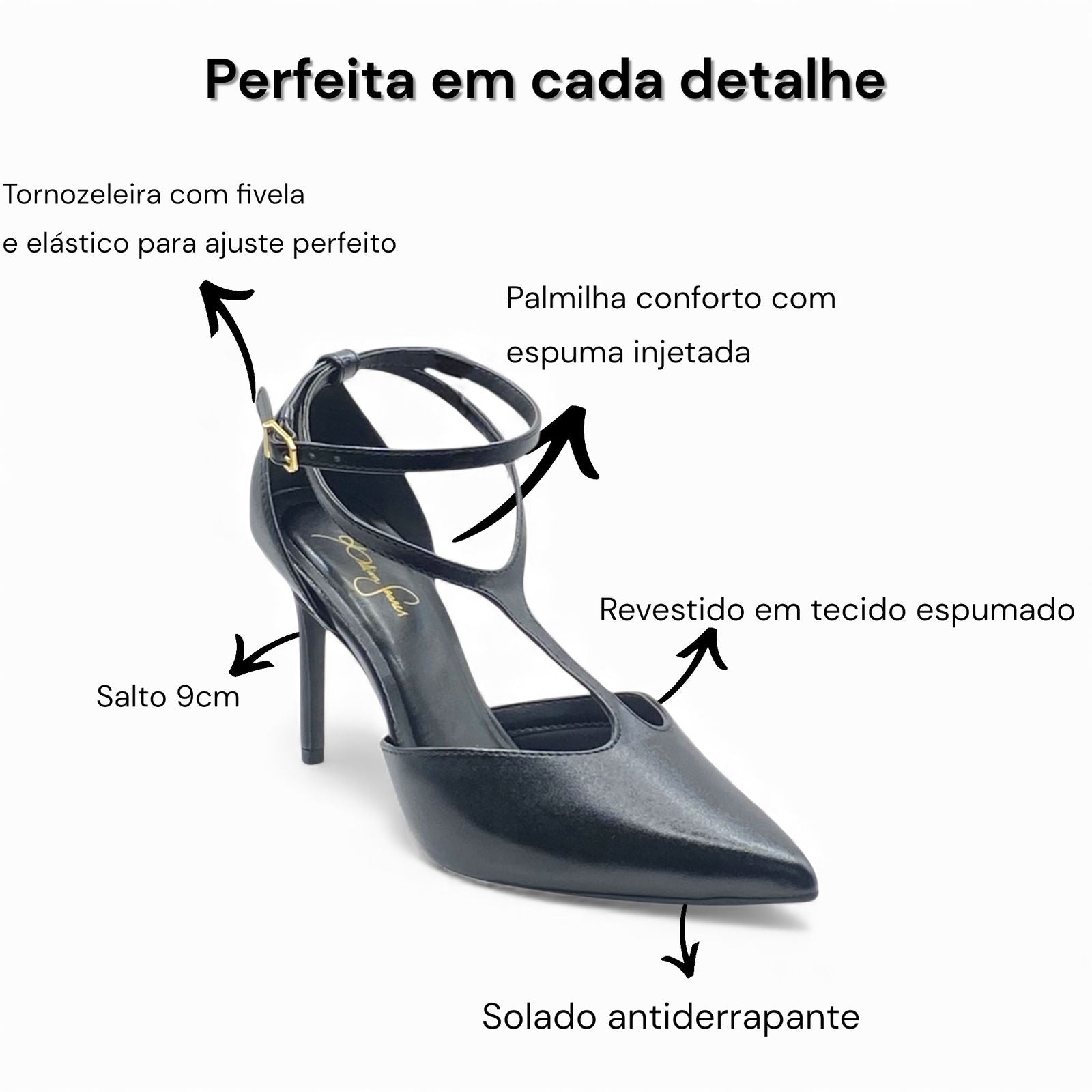 • Bico fino elegante: alonga a perna e traz sofisticação instantânea.