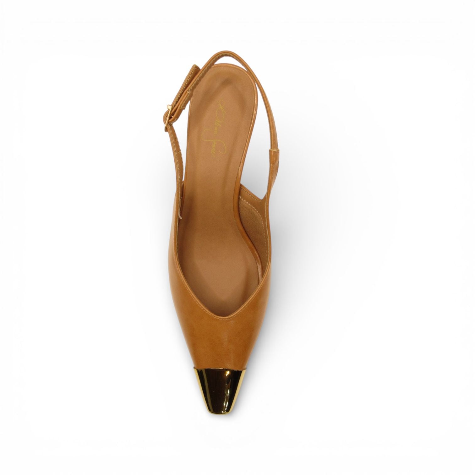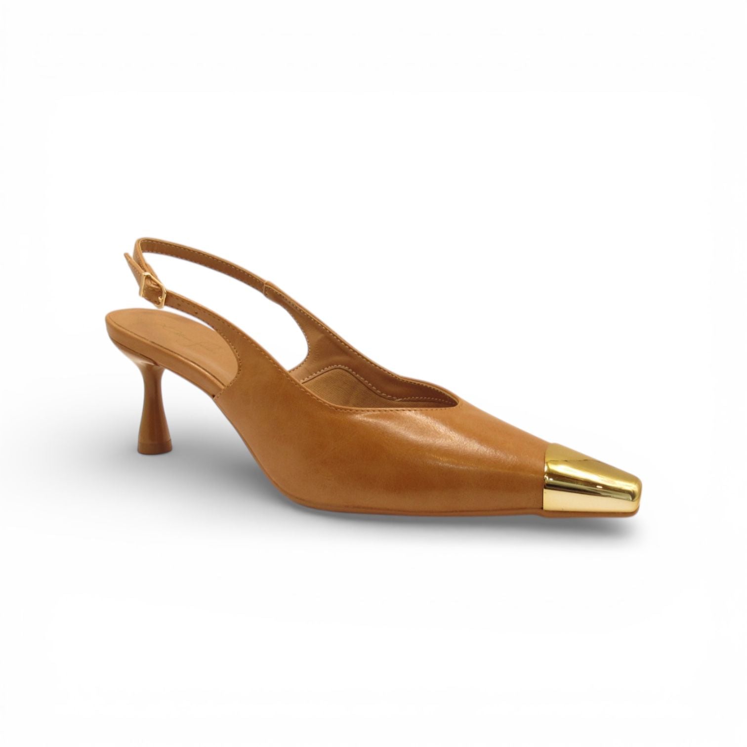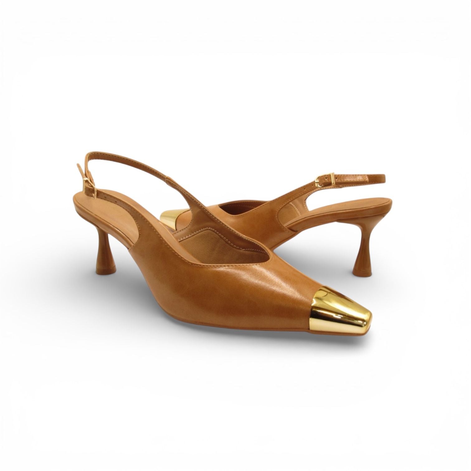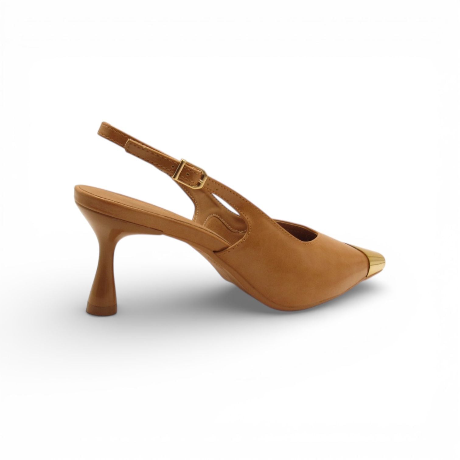 Slingback Caramelo Lilian Soares com Bico Dourado Cromado – Versatilidade Sofisticada em Cada Detalhe